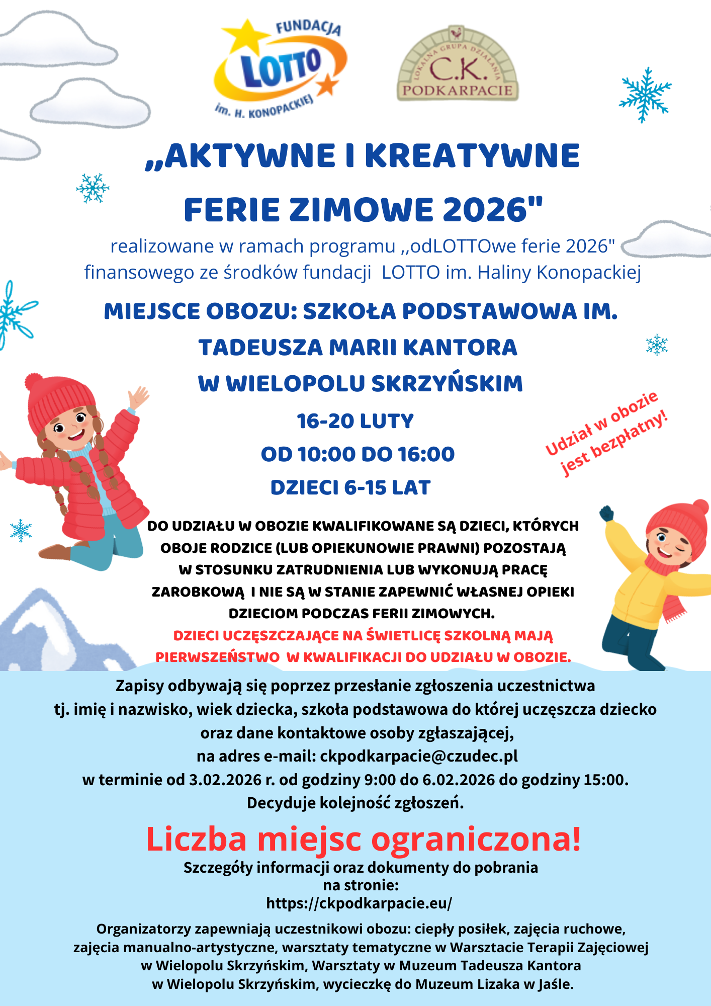 Przyjęliśmy i zweryfikowaliśmy Państwa zgłoszenia. Poniżej publikujemy listę zakwalifikowanych uczestników, których witamy w projekcie pn. „Aktywne i kreatywne ferie zimowe 2026” z Fundacją LOTTO im. H. Konopackiej, w ramach którego organizujemy bezpłatny, 5-dniowy obóz zimowy, w Szkole Podstawowej im. Tadeusza Marii Kantora w Wielopolu Skrzyńskim.Zajęcia odbędą się w terminie 16–20 lutego 2026 r. w godzinach 10:00–16:00. Przed przystąpieniem do projektu, od rodziców zakwalifikowanych dzieci, wymagamy dostarczenia podpisanych deklaracji uczestnictwa i stosownych oświadczeń, dokumenty można pobrać ze strony https://ckpodkarpacie.eu/aktualnosci/ by złożyć w świetlicy lub sekretariacie szkoły najpóźniej do 12 lutego 2026 roku do godz. …